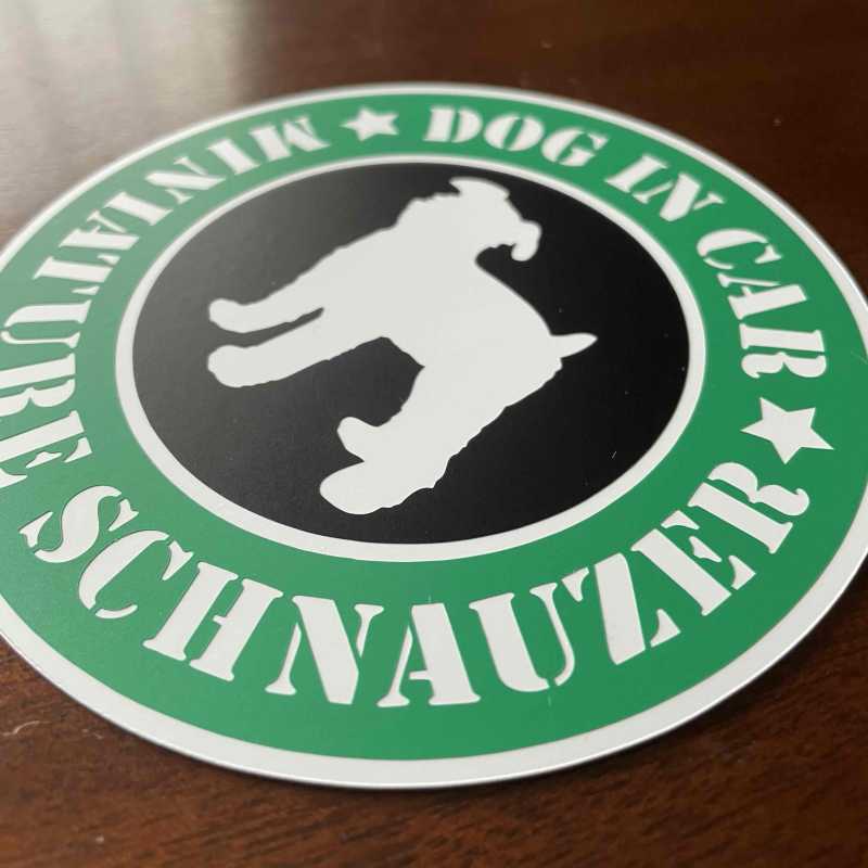 「DOG IN CAR / シュナウザー」のオリジナルマグネットステッカーです。カッティングステッカーをマグネット仕様に加工しているので、貼り付け時の失敗がありません。