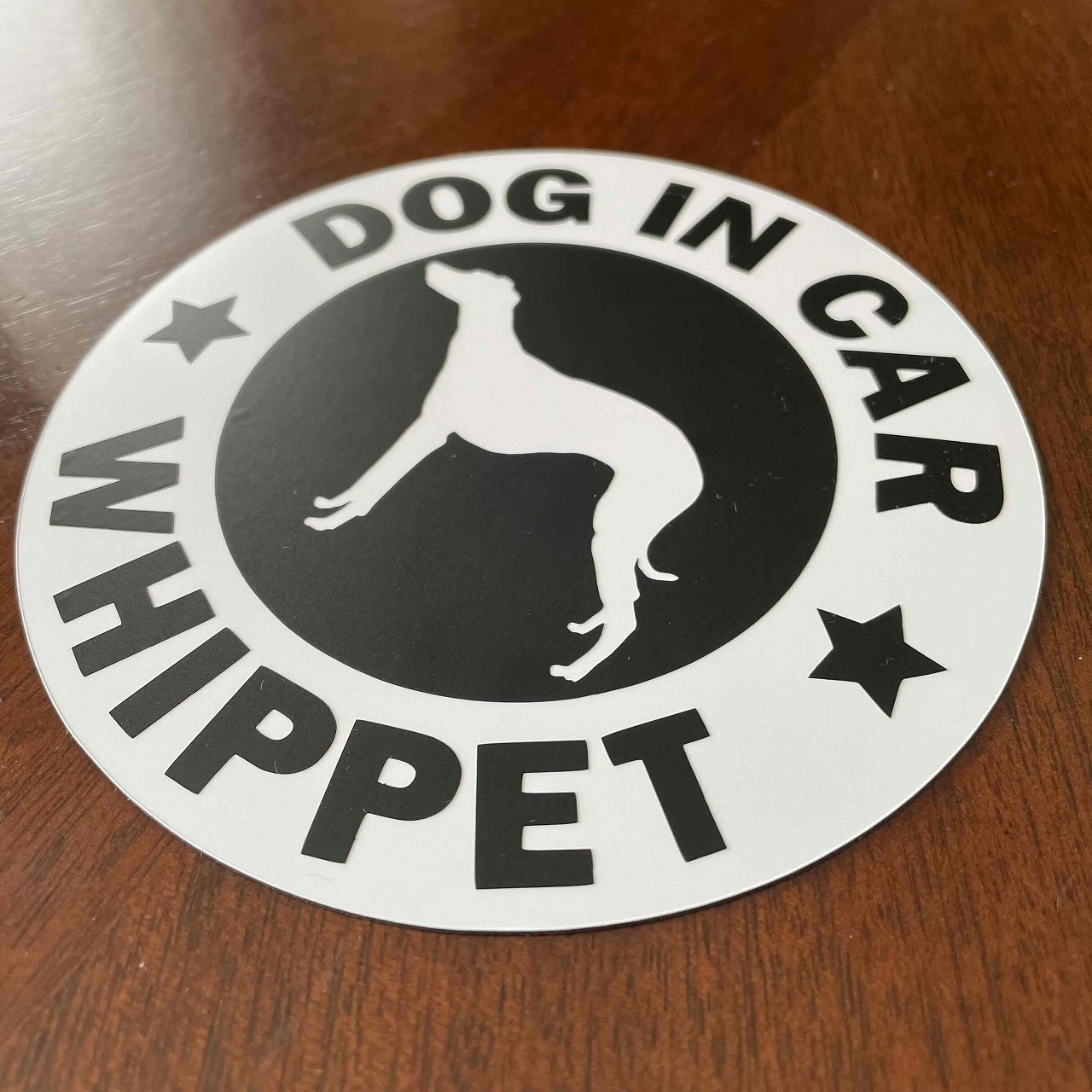 「DOG IN CAR / ウィペット」のオリジナルマグネットステッカーです。カッティングステッカーをマグネット仕様に加工しているので、貼り付け時の失敗がありません。