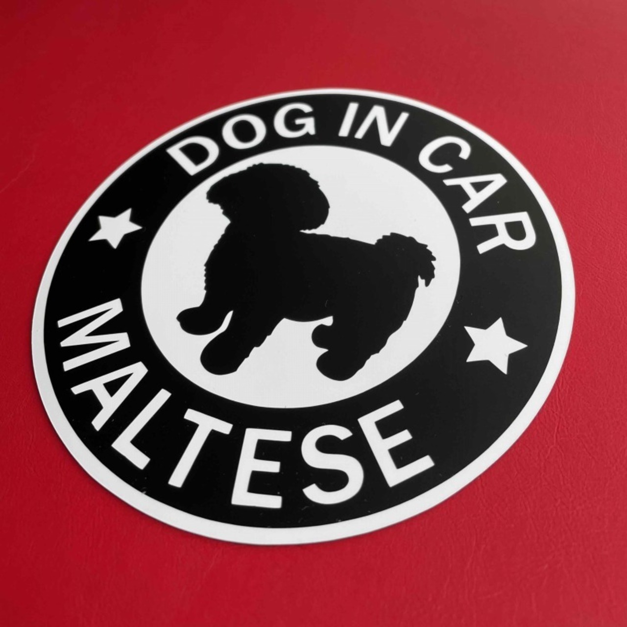 「DOG IN CAR / マルチーズ」のオリジナルマグネットステッカーです。カッティングステッカーをマグネット仕様に加工しているので、貼り付け時の失敗がありません。