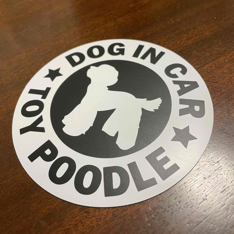 「DOG IN CAR / トイプードル」のオリジナルマグネットステッカーです。カッティングステッカーをマグネット仕様に加工しているので、貼り付け時の失敗がありません。