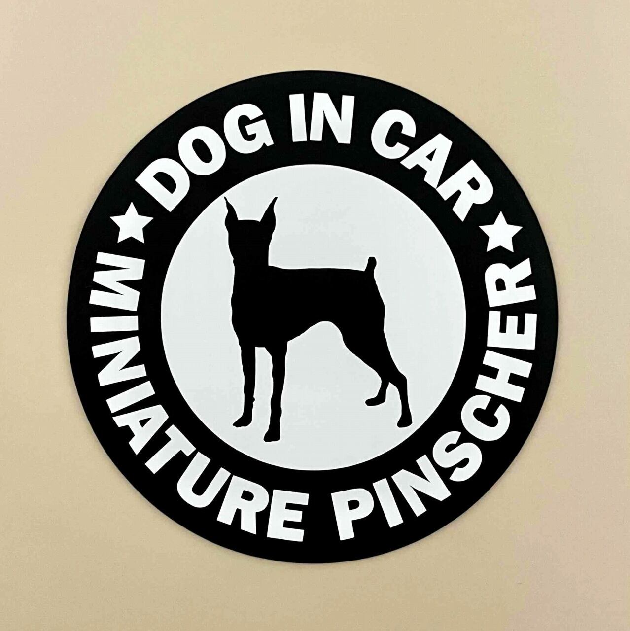 「DOG IN CAR /ミニチュアピンシャー」のオリジナルマグネットステッカーです。カッティングステッカーをマグネット仕様に加工しているので、貼り付け時の失敗がありません。